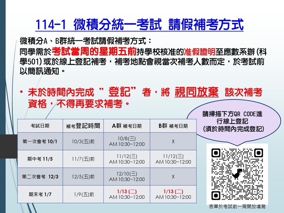 一定要在登記截止前完成線上登記才具備補考資格。(如有任何疑問,請至應數系辦詢問)